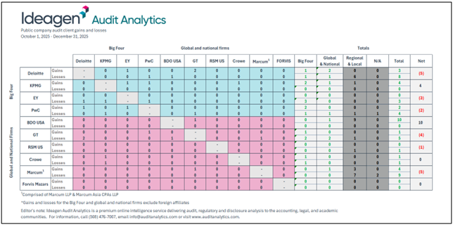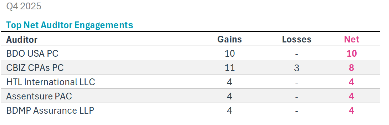 CBIZ CPAs PC gained the most audit clients in the fourth quarter of 2025 with 11 new clients. CBIZ lost 3 clients in the quarter, resulting in a net gain of 8 engagements. This continues CBIZ's strong performance following its acquisition of Marcum's attest business in November 2024.