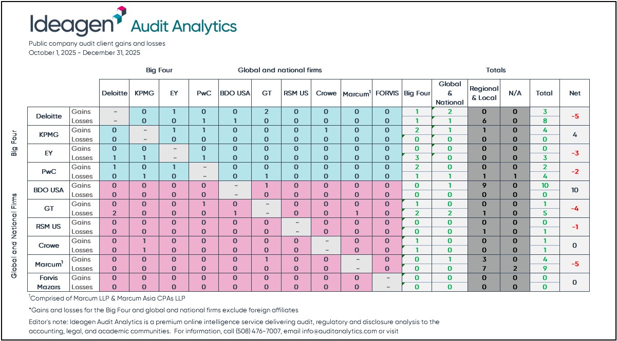 BDO USA PC gained a net of 10 Securities and Exchange Commission (SEC) audit clients, the highest net of all auditors in this fourth quarter. BDO gained 10 clients and lost no audit clients during the quarter, demonstrating strong market momentum.