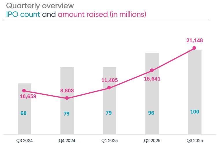 In the third quarter of 2025, there were 100 new initial public offerings (IPOs), which raised $21.2 billion. Total IPOs increased by 4% from the first quarter and total gross proceeds increased by 35% over Q2 2025.