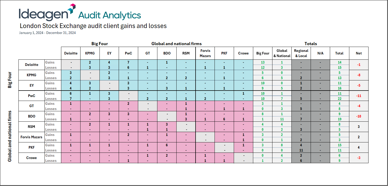 Across the London Stock Exchange, amidst a net gain of four clients in 2024 (154 wins vs. 150 departures). The Big Four ceded share on net, with none showing in the top five overall or in the individual sub-markets, a pattern that underscores how midtier challengers are capturing momentum amid ongoing client churn.